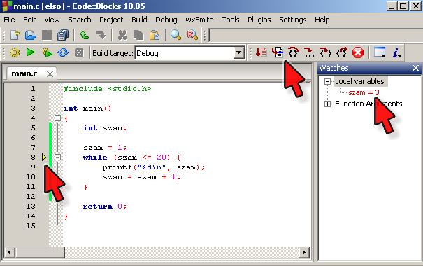 Próbáld ki a nyomkövető használatával is! A Code::Blocksban a nyomkövetést legegyszerűbben úgy tudod elindítani, ha arra a sorra állsz a kurzorral, ahol először meg szeretnéd a programot állítani, és megnyomod az F4-et (Debug/Run to cursor). Innentől a program az F7-tel léptethető soronként (Debug/Next line). A „Debug/Debug windows/Watches” menüponttal hívhatod elő az ablakot, amelyben a változók (Local variables) értékét tudod figyelni. A piros nyilak jelölik az érdekes részeket az alábbi képen, egy másik programon bemutatva: