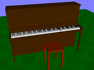 Ezután pedig minden objektum elhelyezése előtt úgy forgatjuk a világot (nem az objektumot!), hogy a világ álljon be az objektum által elvárt irányba. Ezt a lehetőséget a zongora billentyűinél fogjuk kihasználni. A billentyűk koordinátái a programban úgy vannak megadva, hogy a föld síkjával párhuzamosak, és az origóban vannak. A világ eltolása és elforgatása miatt lesz egy zongorabillentyű helyett sok, és amiatt lesznek lenyomva is. Ez így néz ki: