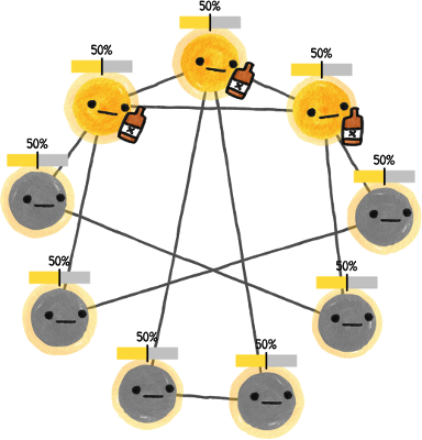 Sok szociológiai jelenség megmagyarázható a kapcsolatok (kapcsolati hálók) ismeretével. Az alábbi ábra példát mutat erre. A jelenség itt: a közösség minden tagja úgy gondolja, hogy a közösség 50%-a alkoholista. Valójában ez nincs így, csak a közösség egyharmada nagyivó. Azért érzik így mégis, mert az ismerőseik 50%-a tényleg az, és ezt vetítik ki a teljes közösségre.