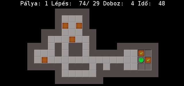 A házim egy sokoban játék, SDL-el készült. Klasszikus doboztologatás a zöld bogyóval (aki mindig abba az irányba néz, amerre irányítjuk). Irányítani a nyilakkal, vagy WASD-al kell, lehet újratölteni, pályát léptetni, de csalni nem :). A pályát txt-ből olvassa be. Látványelemek: a pályák, a ranglista (csodálatos kék) és a pálya befejezésekor megjelenő szöveg. A legjellemzőbb a beküldött screenshot (a tesztelés során akkor csináltam új, sokkal egyszerűbb pályákat, amikor rájöttem, hogy ehhez a pályához min 240 lépés kell és még hátravan 15 :D). A képen láthatjuk a pálya sorszámot, a lépések/tolások számát, a még betolásra váró dobozok számát, az eltelt időt és a játékteret.