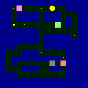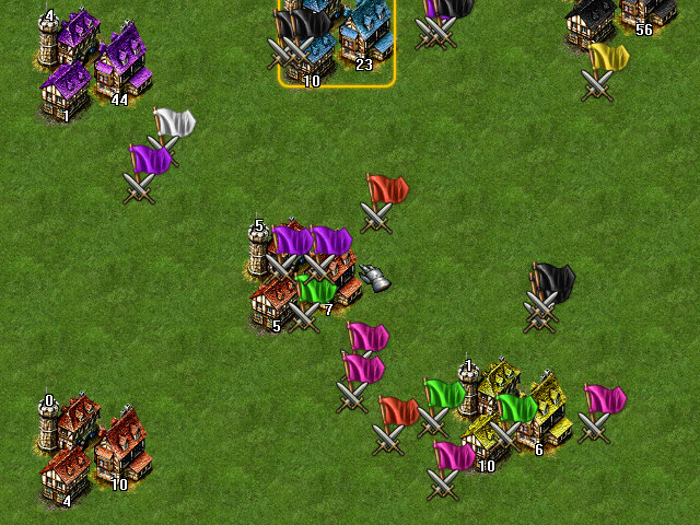 Itt az én nagy házimról egy screenshot, amin a stratégiai játékom egyik meccsének egy pillanata látható. A különböző színek egymás ellen vannak, a falvakban vannak parasztok, nyersanyagok és katonák, és a katonákat zászlóaljanként lehet kiküldeni a többi falura (amit aztán elfoglalnak, ha ott kevés ellenséges katona volt.) A sárga négyzettel jelölt falu az én falum, a többit a gép irányítja egy "buta" AI algoritmussal (amit ennek ellenére meglehetősen nehéz leverni).