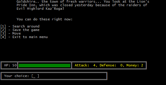 Egy szöveges szerepjátékról van szó, amiben harccal lehet aranyat szerezni, amiből lehet vásárolni tárgyakat, pl.: pajzsot és kardot. Az interfész lett szerintem a legmutatósabb, ezért erről készítettem screenshotot. A három fő statisztika a támadás, védelem, és arany. Plusz ezek mellett még a játékos élete is ki van írva minden alkalommal, a csík pedig arányosan csökken a HP-val.
