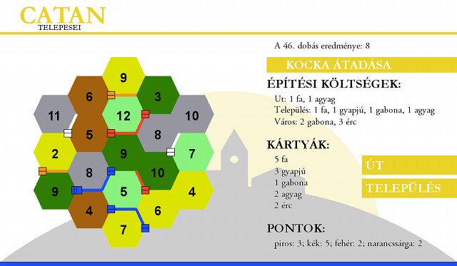 Az első képen a játék menüje látható, a másodikon a játékfelület. Bal oldalon a pálya kapott helyet amely színes hatszögekből áll, ezek a nyersanyaglelőhelyek. A kereszteződésekben a települések és a városok, a hatszögek találkozásánál az utak láthatók. Az alsó színes csík mindig a körön lévő játékos színét jelzi. Jobb oldalon az ÉPÍTÉSI KÖLTSÉGEK alá tartozó felirat állandó, a többi felirat változik a játék szakaszától, a körön lévő játékostól és nyersanyagaitól függően.