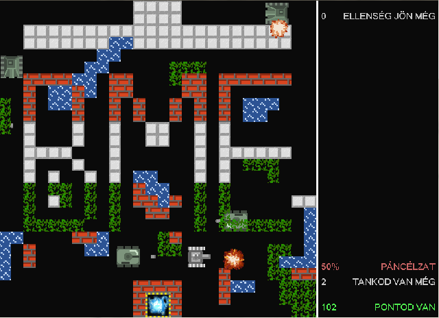 Az én programom egy régi, Battle Citynek nevezett konzolos játékot utánoz le többé-kevésbé. Alapvetően a játék célja, hogy legyőzzük az ellenséges tankokat, miközben a képernyő alján, középen látható objektumot is megvédjük. Az én verzióm több hasonlóságot is mutat az eredetivel, többek között a pályát alkotó elemek és funkciójuk megegyezik (bár a téglafal kicsit másképp omlik). Emellett a legelső pálya tökéletes mása az ötletet adó játék legelső pályájának. Gondolom ez könnyen kitalálható, de a képen látható pálya nem szerepelt az eredetiben :) A mellékelt képen a három fajta ellenség közül a kettes (gyors) és a hármas (erős) szintűek láthatók.