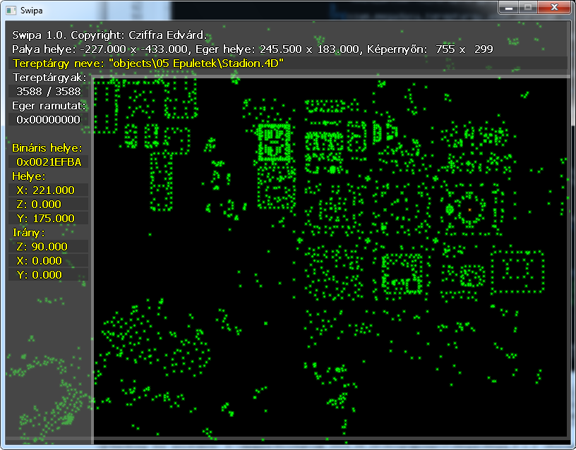 A S.W.I.N.E. (2001-ben kiadott) játékhoz készítettem egy pálya szerkesztő programot. Meg lehet vele nyitni a *.scene pályákat, a tereptárgyak hely és irány koordinátáit lehet vele módosítani és a változtatásokat elmenteni. A szerkesztéshez mind az egeret, egér görgőt illetve billentyűzetet lehet használni. Hibás pálya fájl esetén jelzi a hiba okát, néhány tipikus hibát (Pl.: elírt tereptárgy darabszám a fájlban) ki is tud javítani.