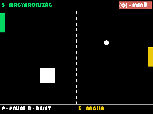 Az én játékom az 1972-es PONG játék egy felújított verziója. A minimalista dizájn és a két játékos mód maradt. Kicsit színesebb lett, került bele számítógépes ellenfél és eredményjelző tabella. Raktam bele még egy nehezített módot, amiben a képen is látható módon egy akadály nehezíti a labda tovább adását, ez az akadály 3 másodpercenként változtatja a helyét teljesen tetszőlegesen.