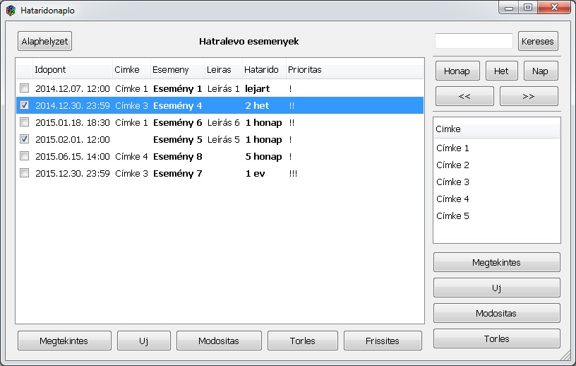 A programom egy határidőnaplót valósít meg grafikus felhasználói felülettel, amihez a GTK+ könyvtárat hívtam segítségül. Új események hozzáadásán kívül lehet a korábbiakat módosítani, illetve törölni is. Lehetővé teszi a címkézést, így nemcsak dátum (hónap/hét/nap) szerint vagy kereséssel, hanem címke alapján is lehet szűrni az események halmazát. A program kiírja az egyes eseményekig hátralévő időt. Használatával nem feledkezünk meg egy ZH-ról sem, bár elalvás ellen (még) nem véd.