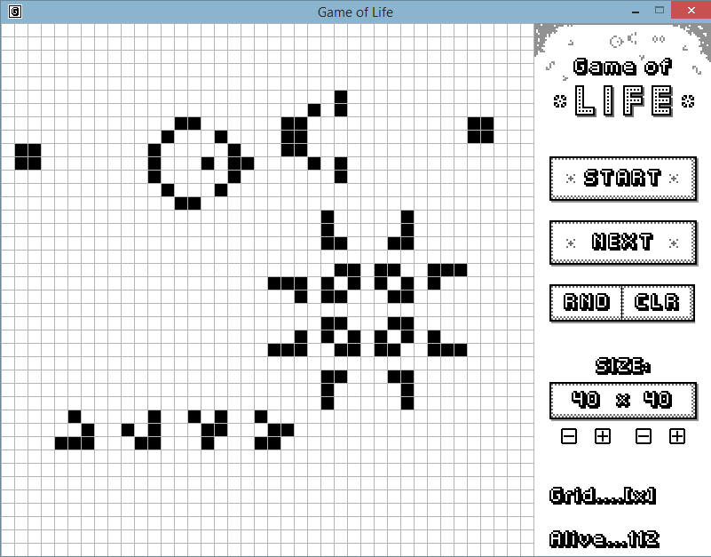 Már korábban is hallottam a Conway's Game of Life játékról, ezért amikor megláttam a nagy házi kiírást, és hogy lehet ilyet választani, nem volt kérdés mit fogok csinálni. Maga a program elég egyszerű: lehet kattintással rajzolni a pályára, aztán csak el kell indítani a szimulációt. Lehet még random állapotot generálni, törölni, pályaméretet állítani.