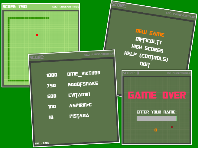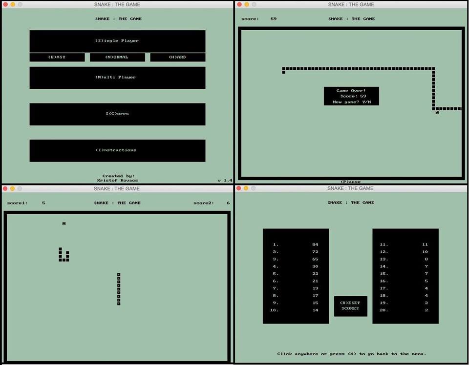 A "SNAKE: THE GAME" nevű játékot írtam meg, amelynek Single Player és Multi Player funkciója is van. Mindkettőn belül választhatunk Easy, Normal és Hard nehézségi fokot, amelyek által változik a kígyó gyorsasága és így a játék nehézsége is. A játék menüje irányítható billentyűzettel és egérrel. A cél az, hogy a kígyó minél nagyobb score-t érjen el, anélkül, hogy a falnak, magának, vagy Multi Playerben az ellenfelének menjen. A legjobb 20 highscore-t a játék elmenti csökkenő sorrendben, így bármikor összehasonlíthatjuk az általunk elérttel. A játék alatt zene fut, ami a hangulatot biztosítja, leáll, ha vége a játéknak és ezt még egy "Game Over" hang is jelzi.