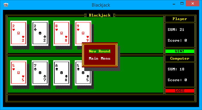 A programom egy klasszikus Blackjack megvalósítása virtuális formában. A grafika megalkotásához a Windows-os text-képernyő lehetőségeit használtam ki. A GUI, illetve a kártyák kirajzolásához az ASCII tábla speciális karaktereit hívtam segítségül. Nyilakkal vezérelhető menürendszert hoztam létre, amibe a főmenü mellett a játék közben megjelenő pop-up ablakok is beletartoznak. A főmenüben a felhasználó számos lehetőség közül választhat a játék mellett: akár elolvashatja a szabályokat, vagy megtekintheti a korábbi 5 legjobb eredményét is, amit dátummal és névvel együtt tárol a program.